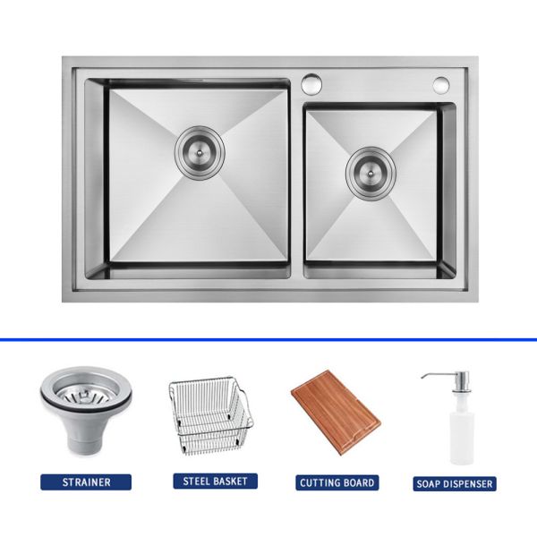 Along with the sink, Handmade Kitchen Sink also includes essential accessories such as a faucet, basket, knife shelf, wood cutting board, waste, drainers, cup washer, and soap dispenser, making it a complete and convenient package for your kitchen needs.